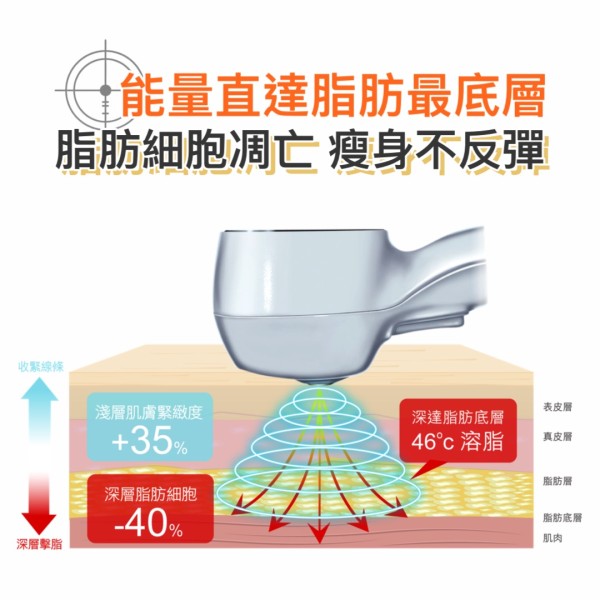 360擊脂緊緻槍結合超聲波及單極射頻技術,透過分層能量導入技術,可以深入肌膚底層,把脂肪層加熱至46°C,令脂肪細胞凋亡,減少脂肪細胞達40%,徹底消脂及防止脂肪囤積。